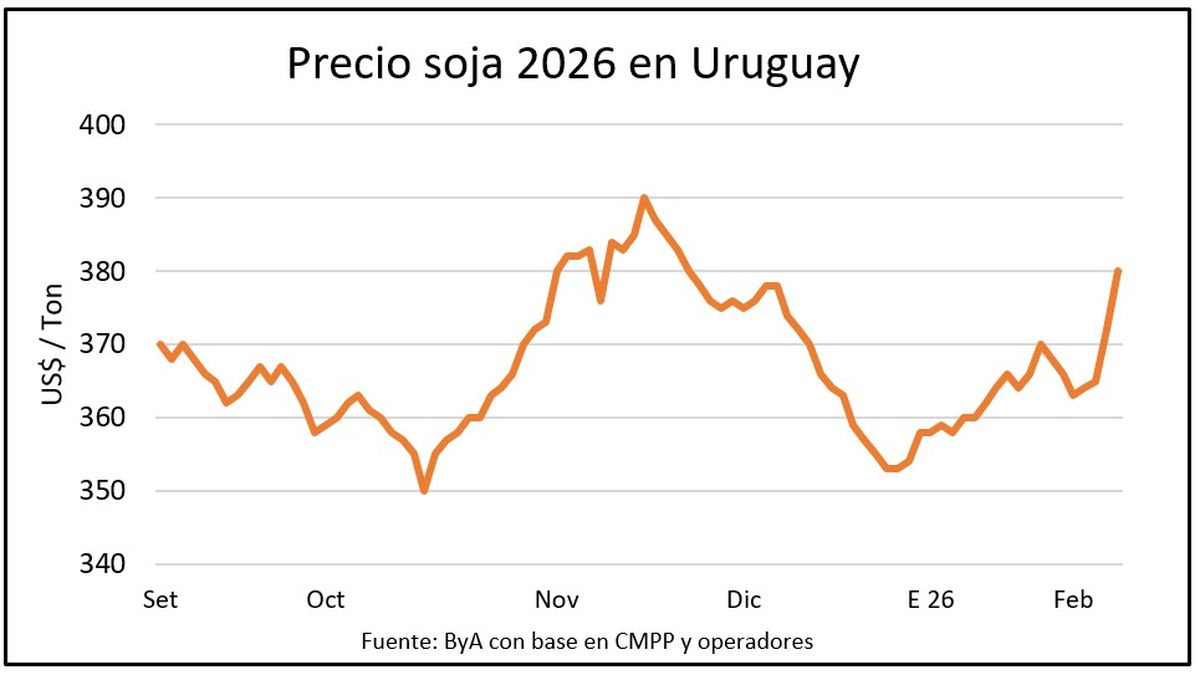 Donald Trump, presidente de Estados Unidos, comunicó a través de sus redes sociales que China acordó incrementar sus compras de soja estadounidense de la actual campaña de 12 a 20 millones de toneladas, un pacto alcanzado con su homólogo chino Xi Jinping. Este anuncio, que se produjo un día después del encuentro entre Xi Jinping y Yamandú Orsi, provocó una escalada en las cotizaciones. En Uruguay, esta situación generó una coyuntura favorable, impulsando los precios locales a US$ 380 por tonelada, un nivel no visto desde finales de noviembre, momento en que los valores también se habían elevado debido a las conversaciones entre Beijing y Washington, que inicialmente sellaron la compra de 12 millones de toneladas, ya concretada.